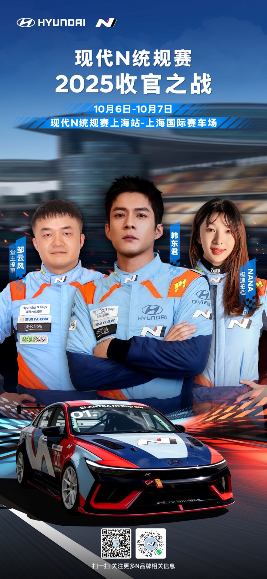 - 作为中国区的收官之战,2025现代N统规赛上海站以其非凡的魅力,吸引了全国各地的赛车爱好者参与。值得一提的是,本场比赛不仅有非常优秀的职业车手参加,还迎来了更多喜欢汽车运动的爱好者们倾力加盟,其中包括备受瞩目的明星嘉宾车手韩东君,以及媒体嘉宾车手刘禹(极速拍档NANA)和邹云风(堂主撩車)